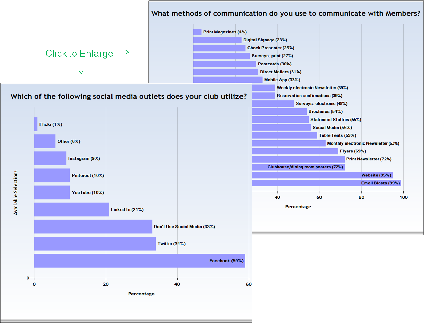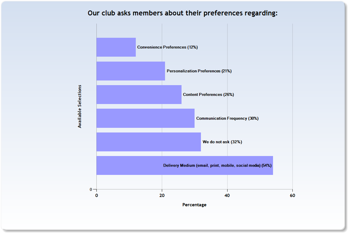 Since so many clubs identify member satisfaction as a top goal for communication, asking members what they want is a logical place to start and about 70% of the clubs said they do poll members about their communication preferences. More than half (52%) ask what delivery medium members prefer and 30% make it a point to ask how frequently members want to hear from the club. Based on the data, about 80% of the clubs contact their members one or more times a week via email. Information overload is more likely to turn members off than to engage them, so asking them about their communication preferences should be considered a best practice.